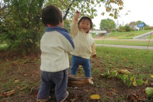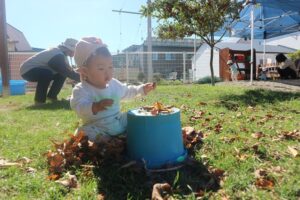 0-5歳 1歳児(ほしぐみ) ・室内で遊ぶことが増えてきて、ブロックで遊ぶと少しずつ友だちと力を合わせて一つのものを作る姿が見られますよ~! ・段々と気温が低くなってきていますが子どもは風の子、元気に遊んでいる子どもたちです!