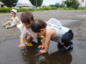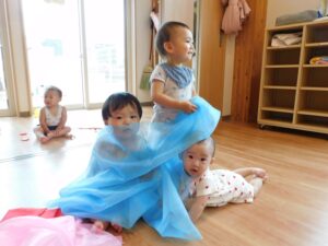 0-5歳 0歳児(ひよこぐみ) いないいないばぁ遊びが大好きなひよこぐみ。 布にかくれて「いないいない・・・」というというと友達の所にやって来て「ばぁ」と布を取ってくれますよ。 自分でかくれたり、お人形に布をかけて遊んでいる姿がとってもかわいいですよ。 散歩先で、水たまりを見つけるとテクテク歩いたり、ハイハイをして水たまりに入っていく子どもたち。 手でビチャビチャ触って楽しんだり、ジャブジャブ入って水の感触を楽しみながら友だちと遊んでいる姿がとってもかわいいですよ。