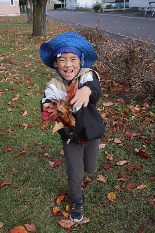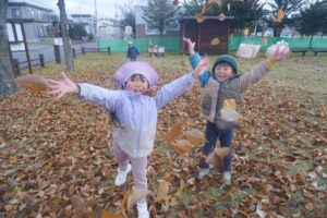 0-5歳 4歳児(ぱんだぐみ) 少しずつ肌寒くなってきましたが元気いっぱい遊ぶぱんだ組! 公園に出掛けるとすぐに落ち葉を集めて『それー!!』と空高く落ち葉を投げたり大人や友達と落ち葉合戦をして楽しんでいます! 短い秋ですがまだまだ楽しんでいきたいと思います!