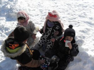 0-5歳 2歳児(うさぎぐみ) 毎日雪遊びを楽しんでいるうさぎ組。 たくさん雪が降った日はチューブすべりにハマり、最後はチューブに座ってお喋りタイム♪ みんなで丸くなりながら大笑いしている姿、とってもかわいかったですよ! 最近では、しりすべりがブームの子どもたち!大勢で一緒に滑ることが楽しくて、 「一緒にすべろう!」「もう一回すべりたい!」の声がたくさん聞こえてきます。 何度も滑っていくうちに、「ワニになってすべる!」「きょうりゅうになってすべってみる!」 などと好きなものになりきりながら、腹すべりもして楽しんでいますよ~♪