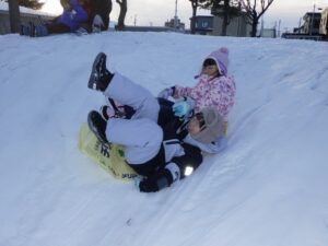 ・雪が降り、公園の坂では肥料袋で坂滑りを楽しんでいます🎵